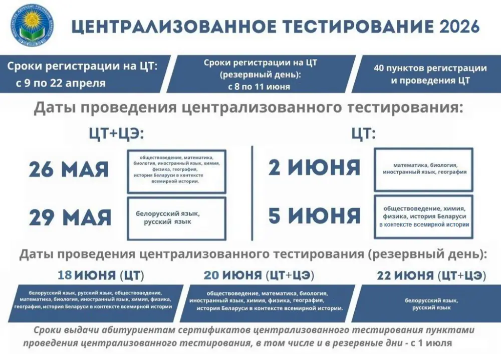 3. Централизованное тестирование по предметам для всех абитуриентов пройдет — 2 и 5 июня. Также 26 мая будет проводится ЦТ для выпускников прошлых лет и студентов колледжей по предметам на выбор, а 29 мая — по русскому и белорусскому языку.